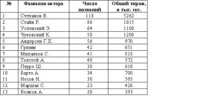 Самые популярные авторы детской литературы распределяются так (по числу изданий в убывающем порядке с указанием тиража):