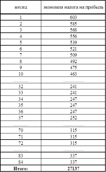 Экономия налога на прибыль при кредитной схеме финансирования, руб.