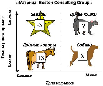 Путем элементарного анализа вырабатываются портфельные стратегии компании - "дойные коровы" служат источником средств и существуют при минимальных вложениях, "звезды" должны накачиваться ресурсами для удержания лидирующего положения, "дикие кошки" - следующий по важности, но более рисковый объект для инвестиций в целях максимального расширения зоны присутствия компании на рынке (если конкуренты позволят), "собаки" же безжалостно изгоняются из бизнеса - ни денег, ни сколько-нибудь существенной доли на рынке они не дают, а являются лишь источником постоянно возрастающих затрат.