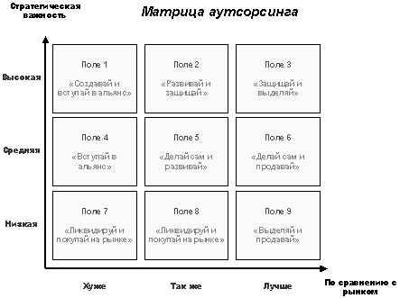 Анализ любых аспектов деятельности компании с помощью "матрицы аутсорсинга" предполагает разнесение таких аспектов (компетенций, функций, переделов, технологий и т.д.) по основным ее девяти полям, и принятие решений в зависимости от поля, в которое такой аспект попал.