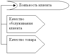 3. Для успешного внедрения стратегии должен быть установлен мониторинг и обратная связь процесса стратегического управления. Для этого разрабатываются сбалансированные счетные карты, отражающие основные цели предприятия, а также их дальнейшую декомпозицию в виде набора критических факторов успеха. Например, если поставить для себя цель «повышение лояльности клиента», то критическими факторами успеха будут являться, например, качество товара и качество обслуживания клиентов. Ниже приведена схема взаимодействия цели и критических факторов успеха в виде отношения «один к многим», однако, на самом деле их взаимосвязь более сложная и может быть охарактеризована как «многие к многим». По сути, один и тот же фактор успеха может влиять на достижение нескольких целей.