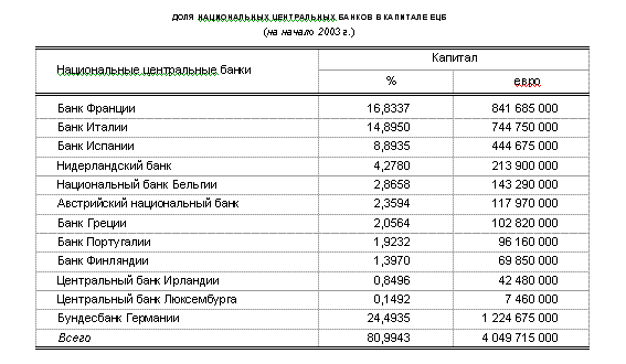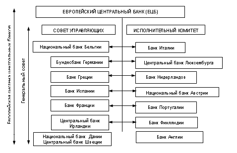 Двенадцать национальных центральных банков, в том числе Банк Франции, Банк Италии, Банк Испании, Нидерландский банк, Национальный банк Бельгии, Австрийский национальный банк, Банк Греции, Банк Португалии, Банк Финляндии, Центральный банк Ирландии, Центральный банк Люксембурга, Бундесбанк Германии, а также Европейский Центральный Банк (ЕЦБ), расположенный во Франкфурте-на-Майне, вместе образуют Евросистему. Структура европейской системы центральных банков представлена на приводимой ниже схеме.