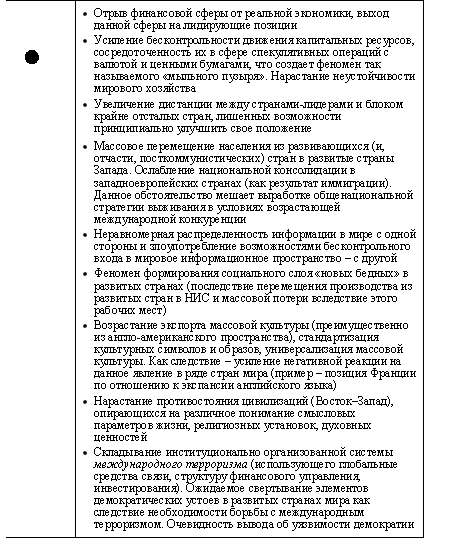 Резкое противостояние Западу стало своего рода защитной реакцией на такие явления, как разрыв традиционных общественных связей, разорение неконкурентоспособных национальных фирм, мощнейшая экспансия чуждых традиционному обществу идей, ценностей, моделей поведения. В итоге неизбежно проявились закономерности: чем сильнее потрясение общества, тем резче ответная реакция, принимающая иногда форму воинствующего национализма и фундаментализма. И не в этом ли истоки развернувшегося терроризма? Организованное террористической сетью нападение на всемирный торговый центр в Нью-Йорке 11 сентября 2001 г. вполне можно расценить как радикальное проявление антиглобализма.