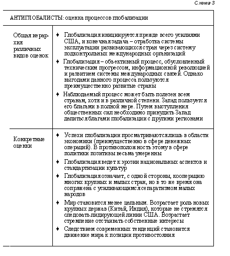 Поскольку глобализация - многоплановое явление, а состав ее противников достаточно пестрый, уместно выделить несколько обобщенных вариантов восприятия указанного процесса (см. схему 3).