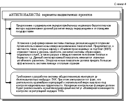Реакция на процесс глобализации имеет логическое продолжение. Оно выражается в выработке противодействующих установок и мер. В этой области расхождения замыслов у участников движения также велики. Однако определенную иерархию в подходах можно обозначить (см. схему 4).
