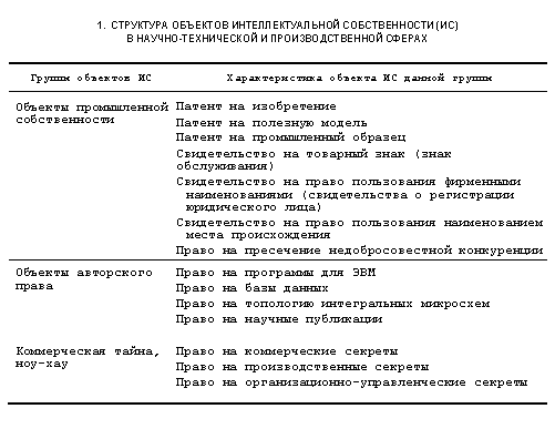 Изложим более подробно данную классификацию, конкретизировав объекты интеллектуальной собственности применительно для каждой группы (см. табл. 1).