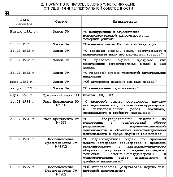 В начале 90-х годов ХХ столетия в российском законодательстве появился новый объект права - интеллектуальная собственность. В свою очередь, этот факт повлек за собой развитие правовой базы, устанавливающей "правила игры" в сфере отношений интеллектуальной собственности (см. табл. 2).