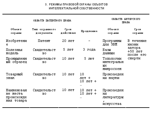 Режимы правовой охраны объектов интеллектуальной собственности унифицированы практически во всех странах, присоединившихся к Стокгольмской конвенции (ВОИС) (см. табл. 3).