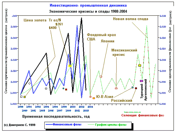 Рис.1. Макропрогноз " Прошлое-Настоящее- Будущее" на 15-летнем интервале общественно-необходимого времени формации. Для наглядности сделана селекция финансовых фаз ( сдвиг на 15 лет от 2004 г. )