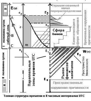 Счетное конечномерное отображение подмножества неразличимых причинных интервалов "относительного времени" в бесконечномерном множестве суперпричинности наделяет "тяготением" ту область и в том временном интервале переноса стоимости, среди их множества, где норма эффективности инвестиций больше. Иначе, темп деградации производственных мощностей (и декапитализация), скорость обращения активов в системе, имеют глубокую внутреннюю взаимосвязь с фактором существующей квазипараллельности временного порядка UTC на мирохозяйственных рынках.