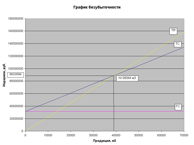 3) При снижении постоянных затрат на 10% (с 31417606,16 рублей до 28275845,55 рублей) прибыль предприятия увеличится до 19966106,50 рублей или на 18,67%. Точка безубыточности (порог рентабельности) увеличится до 35409,80 кубометров продукции. При этом запас финансовой прочности увеличится на 6,52 и составит 41,39%. Как следствие, в результате снижения постоянных затрат на 10% эффект производственного левериджа составит 2,416 единиц и по сравнению с первоначальным уровнем снизится на 0,451 единиц.