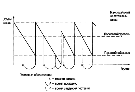 Пороговый уровень запаса используется для определения момента времени выдачи очередного заказа.
