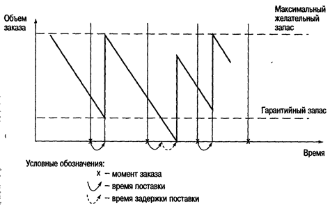 Гарантийный (страховой) запас позволяет обеспечивать потребителя в случае предполагаемой задержки поставки. Под возможной задержкой поставки подразумевается максимально возможная задержка. Восполнение гарантийного запаса производится во время последующих поставок через пересчет размера заказа таким образом, чтобы его поставка увеличила запас до максимального желательного уровня. Гарантийный запас не оказывает непосредственного воздействия на функционирование системы в целом.
