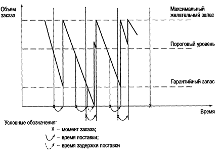В данной системе, как и в системе с фиксированным интервалом времени между заказами, входным параметром является период времени между заказами. В отличие от основной системы она ориентирована на работу при значительных колебаниях потребления. Чтобы предотвратить завышение объема запасов, содержащихся на складе, или их дефицит, заказы производятся не только в установленные моменты времени, но и при достижении запасом порогового уровня. Таким образом, рассматриваемая система включает в себя элемент системы с фиксированным интервалом времени между заказами (установленную периодичность оформления заказа) и элемент системы с фиксированным размером заказа (отслеживание порогового уровня запасов).