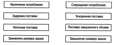 Довольно часто имеют место многообразные сочетания возмущающих воздействий, отклоняющих систему управления запасами от нормального функционирования. На рис. 8 в левом столбце приведены возмущающие воздействия, приводящие систему в состояние дефицита материальных запасов. В правом столбце - возмущающие воздействия, приводящие к возможному дефициту складских площадей (если такой возможен). Правый и левый столбцы отражают гипотетическую ситуацию крайне неблагоприятного суммарного воздействия на систему Более вероятно разнообразное сочетание воздействий, перечисленных в правом и левом столбцах. Эта вероятность зависит от конкретных условий функционирования системы управления запасами