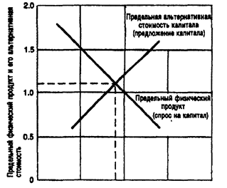 Точка равновесия на графике, отражающая оптимальное соотношение между объемом сегодняшних товаров и их гипотетическим количеством в будущем, и, следовательно, указывающая на оптимальный баланс инвестируемого капитала, определяется пересечением графиков спроса и предложения капитала. Вне ее создается следующая ситуация: рост объема инвестированного капитала повышает физический объем продукции, которая будет произведена в будущем, выше уровня паритета, соотнесенного с сокращением сегодняшнего производства. И хотя предельный физический продукт может оставаться больше единицы, его увеличение не в состоянии компенсировать альтернативную стоимость капитала, обеспечивающего этот прирост.