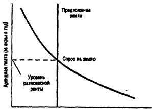 Чистая экономическая рента являет собой доход, полученный посредством любого производительного фактора, предложение которого характеризуется совершенной неэластичностью. Классический пример таких ресурсов — земля и земельные угодья. Площади земельных угодий фиксированы. Вследствие этого предложение земли совершенно неэластично, что графически интерпретируется вертикальной кривой предложения. С другой стороны, спрос на землю, диктуемый величиной предельного продукта в денежной форме, графически представим кривой спроса, имеющей отрицательный наклон. Пересечение этих кривых задает уровень равновесной чистой экономической ренты.