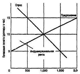 На некоторых рынках, где единицы привлекаемых ресурсов одинаковы по производительности, но различны по степени активности их предложения, возможно ввести такую экономическую категорию, как инфрамаржинальная рента. На рисунке показана ситуация спроса и предложения на услуги сиделок. Начальное предложение рабочей силы на этом рынке формируется при уровне заработной платы 5 долларов в час; привлечение большего количества занятых требует увеличения почасовой оплаты. При равновесной норме почасовой оплаты, составляющей 10 долларов, лишь некоторые получают эту ставку. Остальные получают инфрамаржинальную ренту, которая определяется разностью между равновесной нормой зарплаты и тем минимумом заработка, на который они согласились прежде, чем искать альтернативные источники существования.