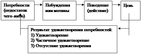 Когда потребность ощущается человеком, она пробуждает в нем состояние устремленности. Побуждение - это ощущение недостатка в чем-либо, имеющее определенную направленность. Оно является поведенческим проявлением потребности и сконцентрировано на достижении цели. Цели в этом смысле - это нечто, что осознается как средство удовлетворения потребности. Когда человек достигает такой цели, его потребность оказывается удовлетворенной, частично удовлетворенной или неудовлетворенной. Например, если вы ощущаете потребность в сложной работе, это может побудить вас попытаться достичь цели в виде получения места, обеспечивающего ее. Получив такое место, вы можете обнаружить, что работа там на самом деле не такая сложная, как вы предполагали. Это может заставить вас работать с меньшим усердием или искать другое место, на котором ваша потребность будет удовлетворена. На рис. 1. показан такой тип поведения.