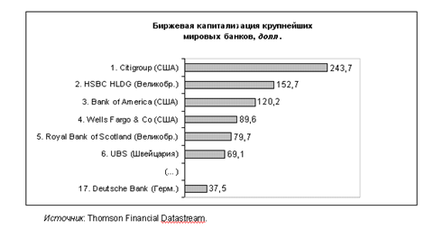 К исходу 2003 г. показатели доходности у большинства банков улучшились, но в целом ситуация продолжает оставаться сложной. По-прежнему убыточными были HVB (-2,6 млрд. евро), Commerzbank (-2,3 млрд. евро) и Drezdner Bank (-1,3 млрд. евро). Прибыль Deutsche Bank (+1,4 млрд. евро) ни в какое сравнение не шла с доходностью зарубежных банков "первой лиги" (прибыль Citigroup, JP Morgan и BNP Paribas составила 14,2; 5,3 и 3,8 млрд. евро соответственно). Биржевая стоимость Deutsche Bank упала к концу минувшего года до 37,5 млрд. долл., и он переместился по этому показателю в списке мировых банковских лидеров со 2-го места в 1990 г. на 17-е (см. приводимую ниже диаграмму). Теоретически Citibank мог бы приобрести Deutsche Bank, истратив на это сумму, равную своей прибыли за пять кварталов. Биржевая стоимость двух других крупных немецких банков HVB и Commerzbank снизилась до 8 млрд. евро.