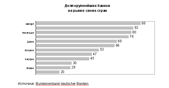 Наряду с усилением специализации, расширением набора банковских продуктов, развитием онлайнового банкинга и возрождением ритэйла важнейшим направлением реформ стало укрупнение банковских структур за счет слияний и поглощений при одновременном сокращении общего количества банков, банковских филиалов и числа занятых. В Великобритании, например, количество банков за последние десять лет уменьшилось на 56%, во Франции - на 43%, в Италии - на 28%, в Испании - на 16%. В среднем по ЕС в формате пятнадцати стран количество банков на 100 тыс. чел. снизилось до 1,6, а число банковских филиалов в расчете на 1 тыс. чел. - до 0,46. В результате повышения концентрации банковского капитала доля пяти крупнейших банков на национальных рынках достигла в среднем 40%.