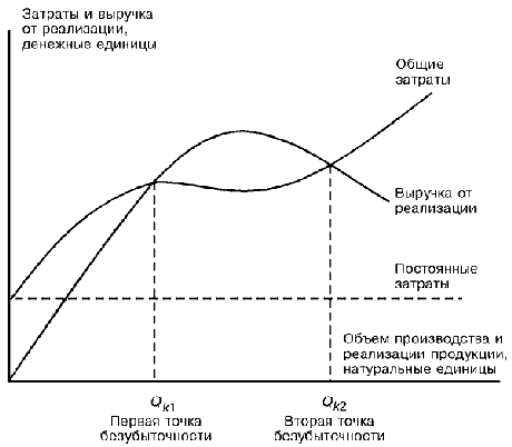 Как видно из рис.1, линия выручки от реализации пересекает линию общих затрат в двух точках. Это означает, что в экономической модели без-убыточности существует два уровня выпуска и реализации продукции, при которых общие затраты равны выручке от реализации, т.е. две точки безубыточности. На поведение совокупных затрат в этой модели наиболее сильное влияние оказывают переменные издержки, изменяющиеся в соответствии с известным эффектом масштаба.