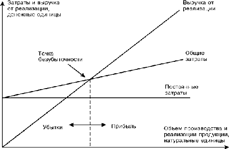 При построении бухгалтерской модели делается допущение о неизменности переменных издержек и цены реализации единицы продукции, в результате чего зависимость выручки от реализации и общих затрат от изменения объема производства и реализации имеет линейный характер. Диаграмма безубыточности по бухгалтерской модели отражена на рис.2.