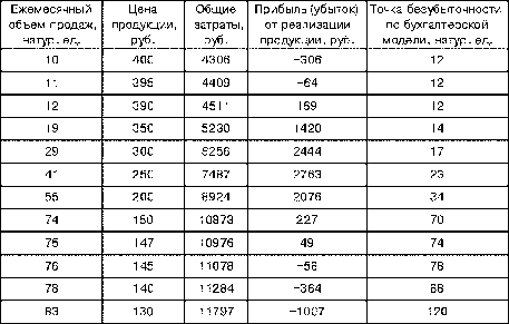 Расчеты, приведенные в табл. 2, показывают, что переход от убыточного к прибыльному производству имеет место при объеме 12 единиц - это первая точка безубыточности, вторая точка безубыточности имеет место при объеме 75 единиц. Рассчитанные пороговые значения продукции задают, таким образом, область объема производства и реализации, в рамках которой обеспечивается безубыточная деятельность предприятия. В то же время, как показывают расчеты, применение бухгалтерской модели дает столько вариантов точек безубыточности для одного и того же вида продукции, сколько вариантов возможных цен подвергается анализу. Данная особенность вызвана допущением постоянства цены реализации. Так, например, при цене 200 руб. ожидаемый объем продаж составит 55 единиц продукции в месяц. При этом точка безубыточности по бухгалтерской модели составляет 34 ед. Однако данная величина рассчитана исходя из следующего предположения: по цене 200 руб. за изделие будут продаваться не только 55 изделий в месяц, но и все другие (большие либо меньшие) объемы продукции. Аналогично, например, при цене 140 руб. прогнозный объём продаж - 78 ед.; точка безубыточности по бухгалтерской модели - 88 ед., в то время как убыток при объёме 78 ед. уже составляет 364 руб. и при увеличении объема производства и реализации (как того требует бухгалтерская модель) этот убыток только возрастет.