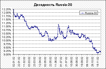 Успехи правительства Путина в проведении экономических и институциональных реформ в России не вызывают сомнений. Осуществление реформ вкупе с улучшением отношения к инвесторам и достижением политической стабильности привело к переоценке рисков, связанных с инвестициями в РФ, что нашло отражение в повышение ее кредитного рейтинга и потеплении отношений с мировым сообществом. Индекс РТС с начала 2001 г. вырос почти в 2,5 раза, а доходность российских еврооблигаций Россия-30 снизилась за указанный период с 16,5% почти до 9% в настоящее время.