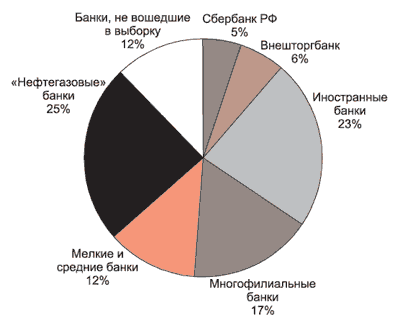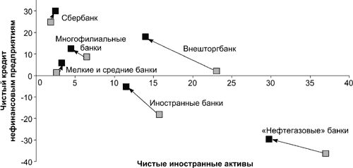 Похожие мотивы двигали и иностранными банками. Большинство из них (особенно крупнейшие— Ситибанк, Раффайзенбанк Австрия, ИНГ Банк Евразия, Креди Лионэ Русбанк) также ощутимо нарастили чистое кредитование предприятий (на 32 млрд. руб., прирост его доли в активах— 12,8%). Закономерно, что значительная часть кредитов этих банков также пришлась на нефтегазовые компании (35–50% по крупнейшим банкам группы).