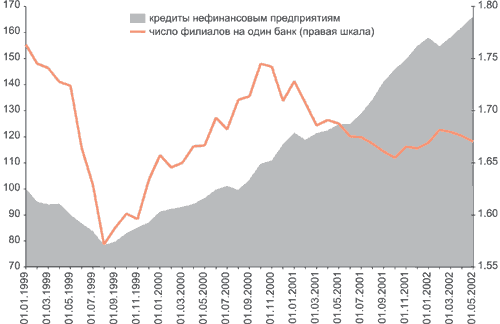 Для многофилиальных банков действует еще один фактор замедления роста кредитов— приостановка процесса расширения филиальных сетей. С середины 1999 г. по 2001 г. число филиалов, приходящихся на один банк, быстро росло, и это обеспечивало экспансию банков на региональные кредитные рынки (см. график 6). В конце 2001 г. интенсивный рост филиальных сетей закончился— наступил этап освоения «завоеванных» рынков, что подразумевает менее агрессивную динамику кредитования.