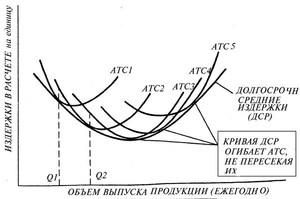 Размеры предприятия, которые вы фактически изберете, будут зависеть от уровня выпуска продукции, который планируется производить в течение достаточно длительного интервала времени, прежде чем вы перейдете к производству в больших масштабах. Выбор размеров предприятия, конечно, не связывает вашу фирму навеки, но он тем не менее вряд ли относится к разряду тривиальных. Дело в том, что нередко маленькая фирма просто не в состоянии взять на себя издержки, сопряженные с выполнением заказа на поставку, предложенного ей значительно более крупным предприятием. Расширение вашей фирмы окажется совершенно бессмысленным, если постоянные издержки, о которых идет речь, не смогут быть распределены на достаточно продолжительный период, обеспечивающий расчетные размеры производимой продукции. Только в том случае, когда вероятность устойчивого долговременного роста выпуска достаточно высока, фирме надлежит переходить от кривой краткосрочных издержек (приведенной на рис.1) к другой. Пять кривых, приведенных на рисунке, представляют собой лишь выборку из множества возможных вариантов предприятий. Рассмотрев краткосрочные кривые, соответствующие предприятиям промежуточных и средних размеров, а так же те, что изображены на рисунке, мы можем начертить долгосрочную кривую средних издержек, или кривую средних издержек для долгосрочных временных интевалов. Эта кривая является огибающей для всех возможных кривых краткосрочных средних издержек. Она соприкасается с каждой из них, не пересекая их. Размеры предприятия, предназначенные для каждого конкретного объема производства в долгосрочном временном интервале, будут соответствовать одной из кривых краткосрочных полных издержек в точке, соответствующей этому конкретному объему выпуска. Из рис.1 , следует, что для каждого данного объема выпуска продукции, запланированного фирмой на долгосрочную перспективу, существует лишь один оптимальный масштаб, предприятия. Может оказаться вполне реальным выпускать данный объем продукции и на предприятии иного размера, но это будет сопряжено с потерями, т. е. с ростом издержек, приходящихся на единицу выпуска. В примере, представленном на рис.1, уровень выпуска Q1 достигается минимальными издержками на предприятии, размер которого соответствует кривой краткосрочных издержек AТC1. Такой же объем выпуска возможен и на предприятии больших размеров, например, на том, которому соответствует кривая краткосрочных издержек АТС2. Но в этом случае издержки, приходящиеся на единицу выпуска продукции, будут выше, чем в первом, поскольку предприятие большего размера недоиспользует свой проектный потенциал. С другой стороны, предприятие, для которого характерна кривая АТС2 имеет оптимальные размеры для выпуска продукции объемом Q2. Этот большой выпуск может быть достигнут и на меньшем предприятии, но лишь путем эксплуатации его с темпом, превосходящим проектный. В терминах издержек на единицу выпуска потери отражаются в том, что кривая ATC1 лежит выше, чем кривая АТС2 при одинаковом объеме выпуска продукции Q2.