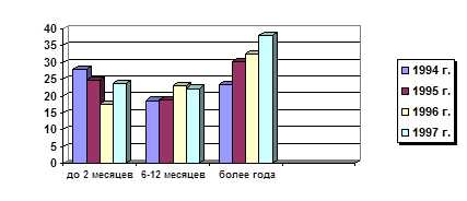 Рис.1. Распределение безработных по длительности периода безработицы в 1994-1997 г. (в %)