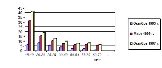 Структура безработицы по социальным группам. Наиболее высокий уровень безработицы наблюдается в последние годы среди молодежи. По данным Госкомстата РФ, в 1997 г. 41% (в 1996 г. – 33%) обследованных в возрасте до 20 лет и 19% (в 1996 г. – 16%) в возрасте 24-24 года являлись безработными. При переходе к страшим возрастам уровень безработицы снижается, высоки темпы роста безработицы среди лиц пенсионного возраста (рис.2)
