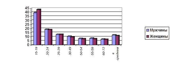 До сих пор широко распространено мнение, что у российской безработицы «женское лицо». В действительности уровень безработицы среди женщин в среднем даже несколько ниже, чем у мужчин. Так, в1998 г. ее уровень среди мужчин составил 13,6 %, а среди женщин – 13,2 %. Только в младшей возрастной группе (15-19 лет) уровень безработицы у женщин выше, чем у мужчин (рис.3)