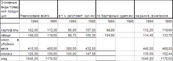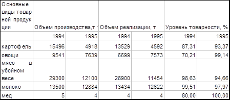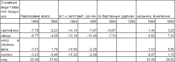 Как видно из таблицы 1, уровень товарности продукции растениеводства и меда в 1995 году значительно возрос, что говорит о снижении потерь. В то же время их производство резко сократилось, что свидетельствует о бедственном положении хозяйства и отсутствии желания работать.
