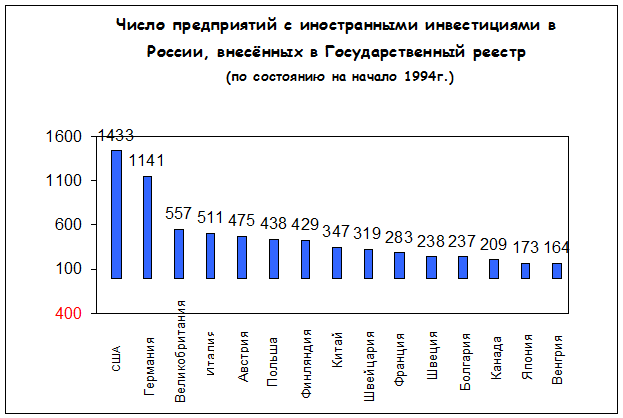 На конец 1996 г. в России были зарегистрированы иностранные инвестиции из 65 стран мира. Основными инвесторами капитала в экономику России являются промышленно развитые страны, среди которых доминируют американские и западноевропейские капиталовложения.