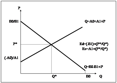 спрос: E(D)=-b1¤(p*/Q*) (2/2), где p*, Q* — равновесная цена и количество.