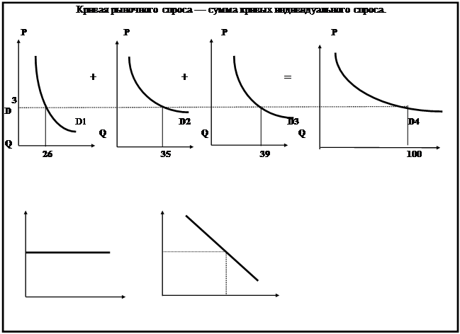 На любом рынке выступает много покупателей, поэтому целесообразно говорить о рыночном спросе. Переход от шкалы индивидуального спроса к шкале рыночного спроса может быть легко осуществлен по средствам суммирования величин спроса, предъявляемого каждым потребителем при разных возможных ценах. Мы просто совмещаем кривые индивидуального спроса по горизонтали, чтобы вывести общую кривую спроса (см. таблицу №2).