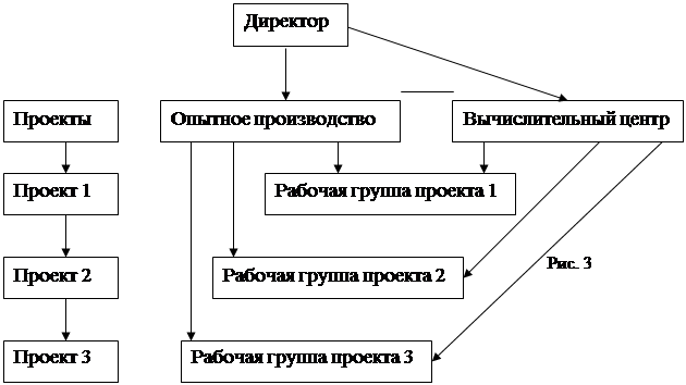 По вертикали строится управление по отдельным сферам деятельности организации, по горизонтали осуществляется управление проектами (рис. 3). Для матричной структуры характерны создание связей между специалистами, организация работ по определённым задачам, вне зависимости от позиции в организации, включенности в конкретное подразделение.