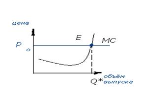 Это правило можно проиллюстрируем графически на рисунке 3. Ро – это цена, при которой фирма может продать любое количество продукции. Эта цена принимается совершенно конкурентной фирмой как данная. Кривая краткосрочных издержек обозначена МС. Предельные издержки растут при высоких объёмах выпуска вследствие закона убывающей отдачи. Оптимальный положительный объём выпуска достигается в точке Е, соответствующий выпуску Q*, в которой Ро=МС.
