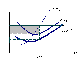 На рисунке 4 показаны три возможных результата этой двух шаговой процедуры. На всех трёх картинках объём оптимального положительного выпуска равен Q*, а АТС* и АVC – это величины средних совокупных издержек и средних переменных издержек при данном объёме выпуска соответственно. На рисунке 4 а цена превышает величину средних совокупных издержек при объёме выпуска Q*. Фирма получает прибыль равную (Р – АТС*), в расчёте на единицу выпуска при объёме выпуска Q* единиц, так что общая величина её прибыли равна затенённой площади. В этом случае фирме непременно следует производить на уровне оптимального положительного объёма выпуска.