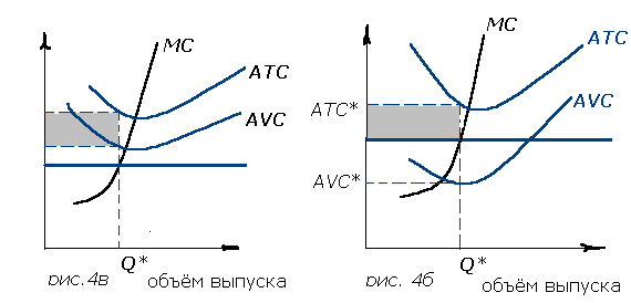 На рисунке 4б фирма теряет меньше, если производит, чем если она прекратит производство, поскольку АVC* ниже существующей цены. На рисунке 4в, где АVC* выше цены, фирма минимизирует свои потери при прекращении производства.