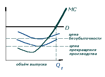 На рисунке 5 показана так же цена безубыточности, равная минимальному уровню средних совокупных издержек. Если рыночная цена равняется цене безубыточности, то цена равна средним совокупным издержкам и фирма является безубыточной, не имеющей ни прибыли, ни убытков в экономическом смысле. При более высоких ценах она получает положительные прибыли; при более низких ценах она несёт потери в краткосрочном периоде. Так как средние совокупные издержки превышают средние переменные издержки при всех объёмах выпуска (вследствие постоянных издержек), то цена безубыточности всегда выше цены прекращения выпуска. Если цена находится между ценой прекращения выпуска и ценой безубыточности, то фирма будет производить свой оптимальный положительный выпуск в краткосрочном периоде, даже не смотря на то, что она не покрывает полностью всех своих издержек. Но в долгосрочном периоде фирма будет вынуждена уменьшить свои средние совокупные издержки или прекратить свою деятельность.