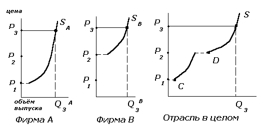 При любой цене совокупный объём, предлагаемый рынку, представляет собой сумму объёмов предложения обеих фирм. Например, при цене Р3 фирма А предлагает объём Q3А, а фирма В – Q3В. Таким образом, совокупный объём предложения при цене Р3 равен Q3=Q3A+Q3В.