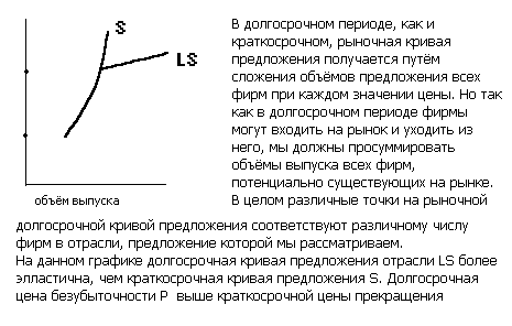 Долгосрочные кривые предложения фирмы и отрасли получаются тем же самым способом, что и краткосрочные кривые предложения. Для фирмы в долгосрочном периоде все виды затрат являются полностью переменными. Различия между постоянными и переменными видами затрат относятся только к краткосрочному периоду. Для отрасли существуют два отличия между краткосрочным и долгосрочным периодами. Во-первых, все существующие фирмы могут свободно изменять все виды своих затрат, и, во-вторых, может меняться число фирм в отрасли вследствие того, что старые фирмы могут уходить из отрасли, а новые – вступать в неё.