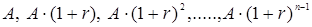 Прямая задача оценки срочного аннуитета при заданных величинах регулярного поступления (А) и процентной ставке (r) предполагает оценку будущей стоимости аннуитета. Как следует из логики, присущей схеме аннуитета, наращенный денежный поток имеет вид: