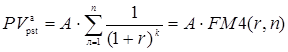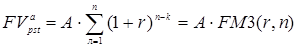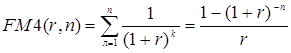 Экономический смысл дисконтирующего множителя FM4(r,n) заключается в следующем: он показывает, чему равна с позиции текущего момента величина аннуитета с регулярными денежными поступлениями в размере одной денежной единицы (например, один рубль), продолжающегося n равных периодов с заданной процентной ставкой r.