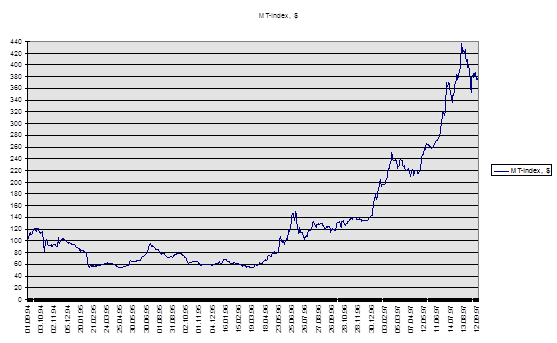 Вплоть до начала 1996 г. российский рынок капиталов находился, если следовать классификации Фабера, в Фазе 1 - несмотря на огромную потенциальную привлекательность рынка в целом, высокие процентные ставки и явную недооценность российских акций, иностранные портфельные инвесторы явно воздерживались от инвестиций на рынке России, опасаясь политической и макроэкономической нестабильности. Однако 1996 г., как уже указывалось в главе IV, принес на рынок большие перемены и российский рынок капиталов по всем позициям перешел в стадию роста. Хорошей иллюстрацией этого роста на примере рынка акций может служить график долларового МТ-индекса (Рис. 4), на котором ясно виден перелом тренда в первой половине 1996 г. Сейчас российский рынок находится, по Фаберу, в Фазе 2 - фазе быстрого роста, сопровождающейся позитивными макроэкономическими и политическими переменами. Резкий рост притока иностранных портфельных инвестиций в российские ценные бумаги подтверждает это. В то же время российский рынок ценных бумаг, очевидно, еще далек от переоценки - так, среднее значение P/Eratio для акций, составляющих МТ-индекс, сейчас равно приблизительно 11,5, что позволяет надеяться на более или менее стабильный рост рынка нынешними темпами на протяжении еще полутора-двух лет. Вместе с тем, анализ с точки зрения теории Фабера указывает на то, что будущее иностранных портфельных инвесторов в России во многом будет зависеть от их участия в конкретных инвестиционных проектах, т.к. рано или поздно рынок будет переоценен, и простое вложение в “индексные” акции уже не будет приносить сегодняшних сверхприбылей.