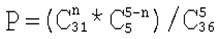 Расчитаем вероятность каждого из событий. Согласно теории вероятности, вероятность угадать n (от 0 до 5) номеров из 36 можно выразить формулой: